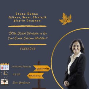 Eğitmen, Yazar, Stratejik Yönetim Danışmanı Canan DUMAN ile “İK’da Dijital Dönüşüm ve En Yeni Esnek Çalışma Modelleri” eğitimi ile merak ettiğiniz konulara değineceğimiz etkinlikte sizlerle buluşacaktır. Sizde derneğimiz tarafından organize edilen etkinliğe katılmak istiyorsanız instagram profilimiz de yer alan formu doldurarak katılım talebinde bulunabilirsiniz. Katılım sınırlıdır.