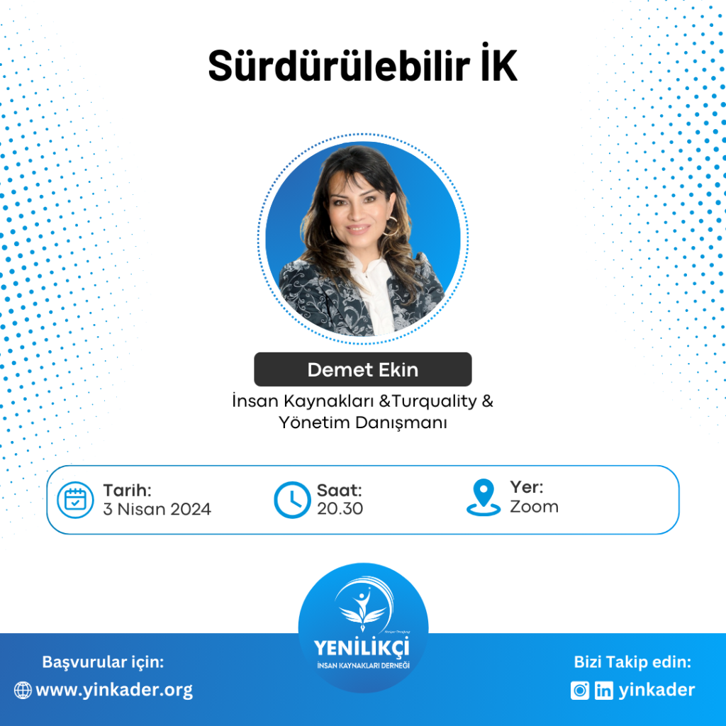 Konuşmacımız Demet Ekin, sürdürülebilir İK uygulamaları konusunda deneyimlerini ve bilgilerini bizlerle paylaşacak. Bu değerli bilgilerle donanmak ve İK dünyasındaki yenilikleri keşfetmek istiyorsanız, bu etkinlik tam size göre!