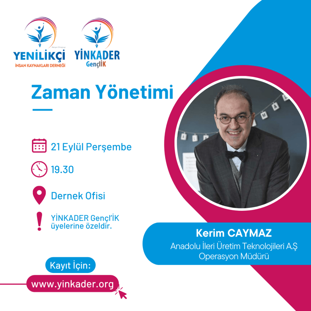 Merhaba değerli GençlİK üyeleri! Dernek Ofisimizde, 21 Eylül’de saat 19:30’da, Anadolu İleri Üretim Teknolojileri A.Ş. Operasyon Müdürü Sayın Kerim Caymaz Bey’in vereceği “Zaman Yönetimi” eğitimine davetlisiniz!